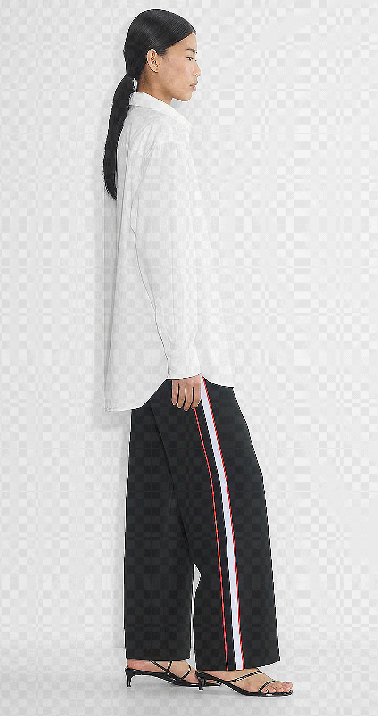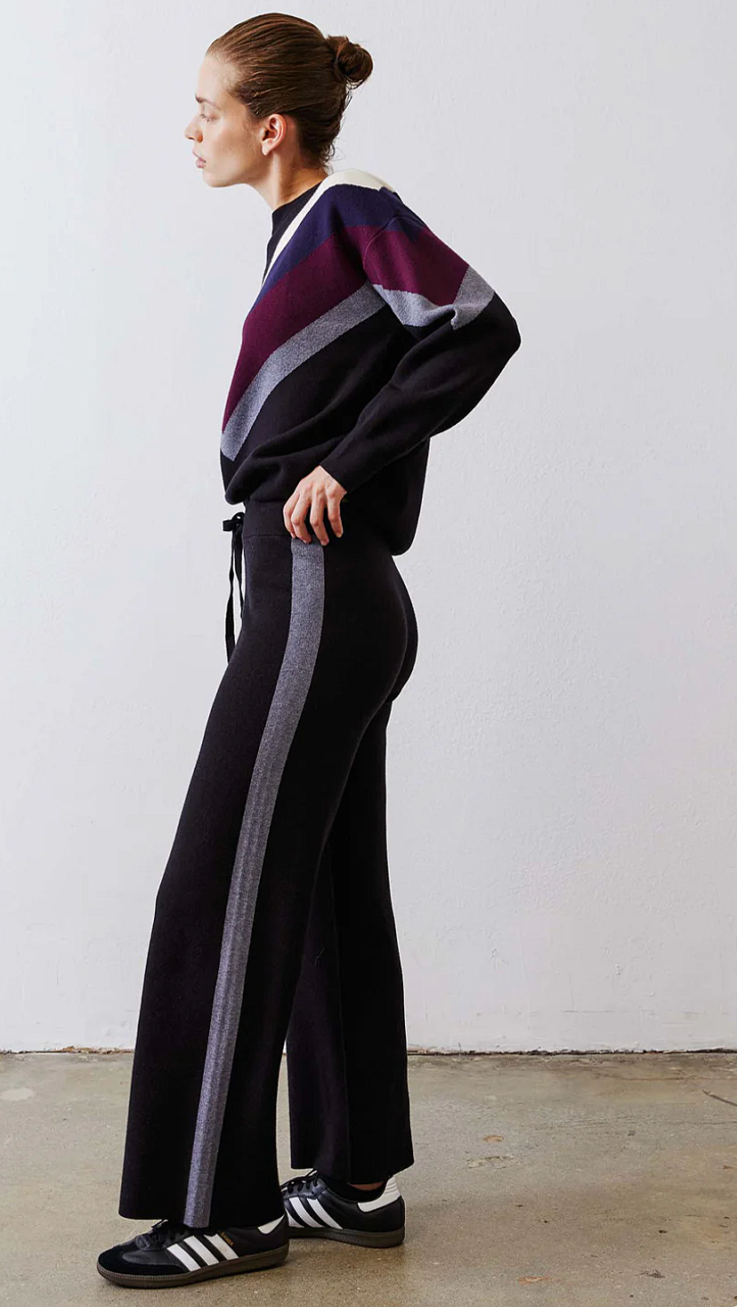 These days track pants have been showing up at dinner parties more than the gym, and I’m here for it. With a more relaxed silhouette than joggers, (no cinching at the ankles) what once had a reputation as an off-duty go-to, now seems to be easily moonlighting as a trouser. And it works. Whether in silk, crepe, cashmere or poly, the new track pant pairs just as well with a tank top and sneakers as it does with heels and an oversized cashmere turtleneck. Put me in ‘um, coach!